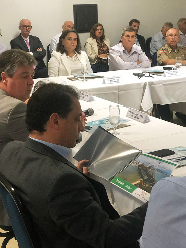 Inicialmente, foi apresentado pelo secretário de Estado da Infraestrutura e Mobilidade, Carlos Hassler, um panorama do atual estágio da obra. O secretário elencou providências que precisam ser tomadas para garantir a entrega até o fim de 2019. Trata-se de investimentos ainda não contratados, no valor de R$ 41,2 milhões. No curto prazo, o mais importante deles é um reforço na estrutura que suporta a ponte, no valor de R$ 3,1 milhões, a ser realizado de maneira emergencial. “Hoje, se esse serviço não for executado, a obra para. Por isso, a importância da celeridade no desenvolvimento desse trabalho”, explicou Hassler.