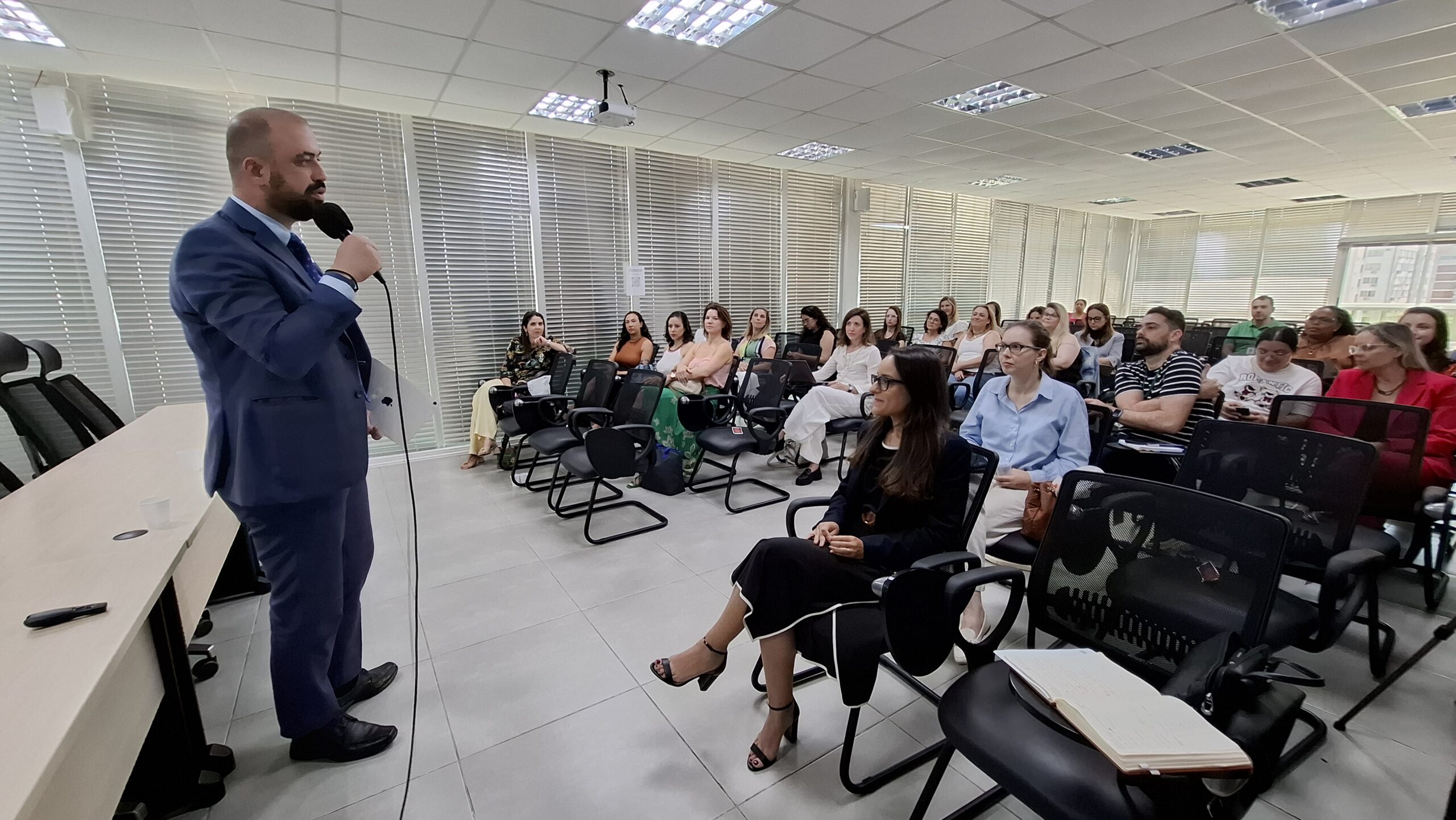 O encontro, realizado no auditório Procuradora Assi Schifter da PGE/SC, reuniu cerca de 40 servidores da área da saúde, além do secretário de Estado de Santa Catarina, Diogo Demarchi Silva, e do procurador do Estado Thiago Aguiar de Carvalho, coordenador do Núcleo de Ações Repetitivas da Área da Saúde (Naras) da PGE/SC.